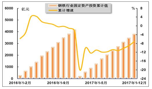 图1 2016年2月-2017年12月钢铁行业累计固定资产投资额及增速走势