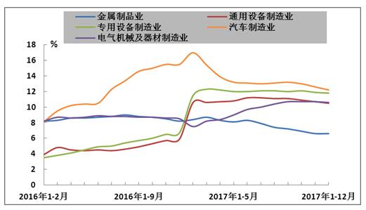 图7 2016年2月-2017年12月主要耗钢工业增加值累计增长率走势