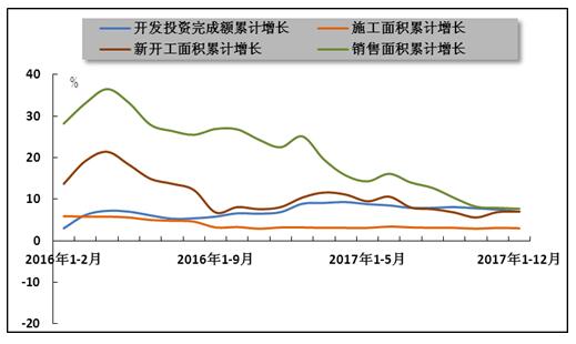 图6 2016年2月-2017年12月全国房地产市场主要指标累计增速走势