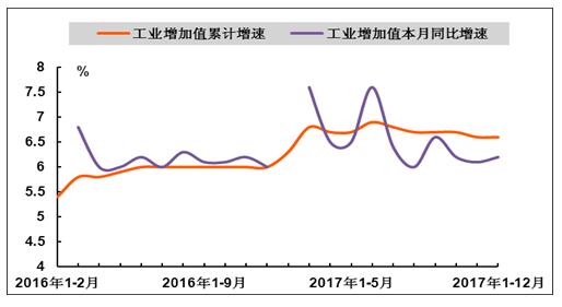 2017年12月,全国工业部门整体保持良好运行态势,工业生产继续稳中向好,对工业用钢需求形成稳定支撑。国家统计局数据显示,2017年1-12月,规模以上工业增加值同比增长6.6%,,增速与2017年1-11月持平,较上年同期加快0.6个百分点。当月来看,2017年12月,规模以上工业增加值同比增长6.2%,增速环、同比分别加快0.1个和0.2个百分点。