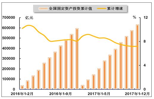 图4 2016年2月-2017年12月全国固定资产投资累计完成额及增速走势