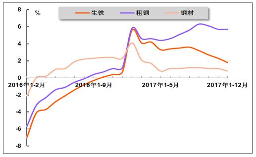 图3 2016年2月-2017年12月主要钢铁产品产量累计增速走势