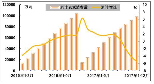 图8 2016年2月-2017年12月钢材累计表观消费量及增速走势