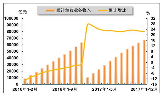 2017年12月,整体高位运行的钢价继续支撑钢铁行业主营业务收入快速增长,但采暖季环保限产以及年末需求走弱带来供需双降,对行业主营业务收入累计增速有所拖累。国家统计局数据显示,2017年1-12月,钢铁行业累计实现主营业务收入67429.6亿元,同比增长22.4%,增速较2017年1-11月放缓0.5个百分点,而上年同期为同比下降0.7%。