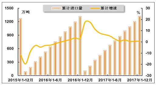 图12 2015年12月-2017年12月钢材累计进口量及增速走势