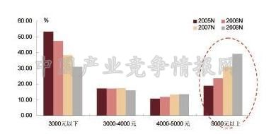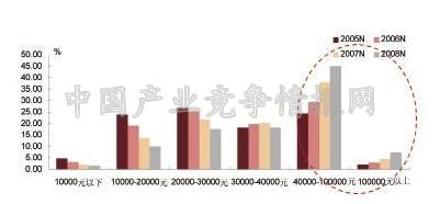 以2007年数据为例,全国居民衣着消费需求约5000多亿元,其中35~45岁人群贡献了其中的近30%,该年龄段人均消费需求在600元/年以上,显著高于平均405元/年的水平。25~29岁人群的服装需求虽仅占总需求的约7.6%,但人均消费需求也接近500元/年的高水平,显示出较强的购买欲望。从这一角度考虑,25~29岁和35~45岁市场势必成为商家重点关注以及竞争十分激烈的区域,也是可挖掘潜力最大的区域。