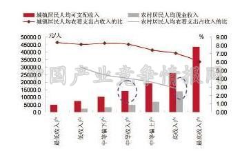 由于农村和城市的生活环境、社会保障制度以及消费环境存在较大差异,农村居民在衣着方面的消费需求显著低于城镇居民。即使是农村中的高收入人群,其收入绝对值与城镇中等收入人群相当,但在衣着上的支出也明显小于城镇中等收入人群。