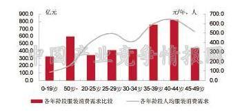 将0~19岁和50岁以上人群定义为储蓄人口,20~50岁人群定义为消费人口,并借鉴统计局公布的人口年龄结构数据和城镇、农村居民衣着消费数据,对各年龄层的衣着消费需求进行测算,发现25~29岁、35~45岁人群具备最强的衣着消费需求。